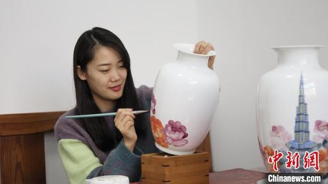 初冬时节,在江西景德镇市靖山堂陶瓷文化创意公司一间工作室内,灯光下,瓷瓶静静矗立、莹润细腻。孙德娜静坐于工作台前,手持画笔,瓷瓶层层着色、渲染,绽放的牡丹错落有致,从底部伸入画面,簇拥在伫立着的哈利法塔旁。