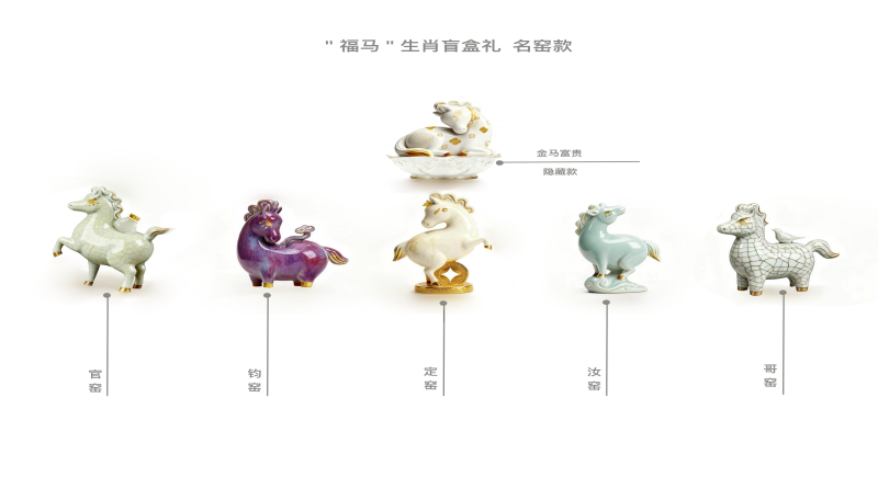 产品品类则涵盖茶器、食器、酒器、咖啡对杯、生肖摆件、赏盘、干果罐、小瓷瓶、陶瓷盲盒、春联十大类,每类产品均融入深厚文化寓意:《富贵吉祥》茶器以牡丹纹、麦穗纹传递安康,《吉祥如意》玲珑瓷餐具借铜钱纹与玲珑工艺寓意财源,《金玉满堂》酒器用金鱼纹、中国结象征富足,《瑞马迎春》生肖摆件以祥瑞红马呼应新年生肖文化;更有《福马》陶瓷盲盒推出哥窑、汝窑等名窑款及“牡丹花座”隐藏款,兼顾趣味性与收藏性。