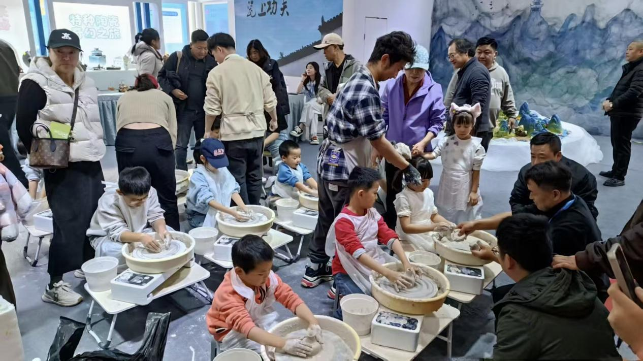 走进博览会14号展厅,欢声笑语最为集中的莫过于“少儿瓷博会·研学体验区”。在“陶艺拉坯体验项目”区,孩子们系着围裙,小手沾满泥浆,在专业老师的指导下,全神贯注地感受着陶轮旋转的魔力。一块块平凡的泥坯,在他们小心翼翼的拿捏下,初显出碗、杯的雏形。家长们则化身最专注的摄影师与助手,一边用镜头记录下这难忘的瞬间,一边与孩子交流创意,现场弥漫着温馨与合作的愉悦氛围。