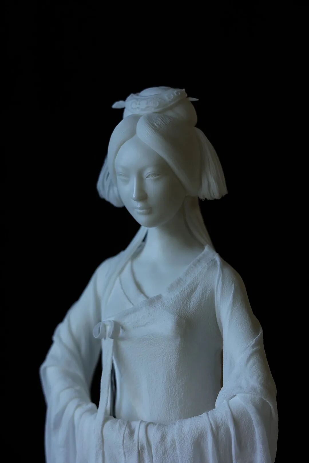 谈及创作契机,连德理笑着回忆:“是儿子给我出的‘命题作文’。”深知90后、00后将成为消费主力,他主动向儿子请教年轻人的审美偏好,最终采纳了以《神话》为主题的创作建议。为了贴合当代审美,作品采用8头身比例,拉长腿部线条,塑造出高挑纤瘦的骨感造型,搭配尖下巴、高鼻梁的面部设计,精准契合了当下的审美趋势。