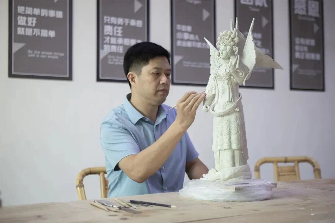 德化制瓷的历史至今已有3700多年,从古代的“猪油白”“孩儿红”到如今的“冰种瓷”,一代代手艺人的创新让这份技艺不断焕发新生。作为传承人,连德理始终坚守“在传统基础上创新,不脱离文化根脉”的原则。他的作品多以女性形象为核心,从《神话》到穆桂英系列、大爱系列,既展现婀娜多姿的古典美,又融入当代艺术表达,“把美做精做细,比传统佛像创作更具挑战,也更能打动人心”。
