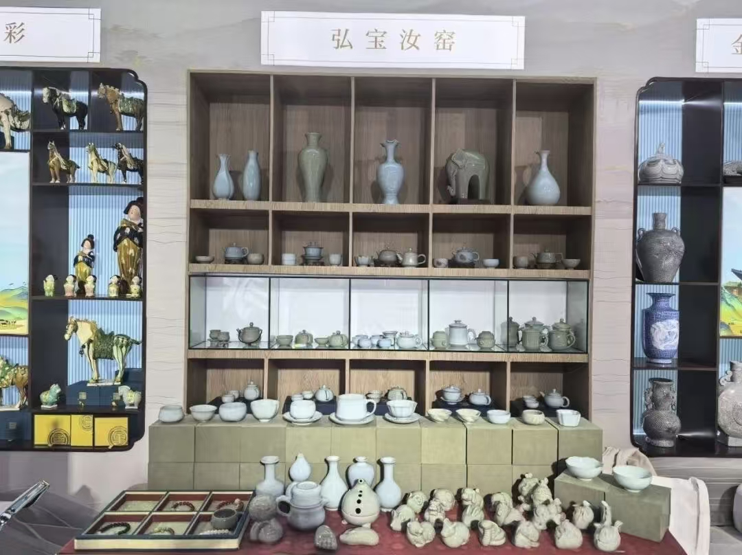 此次参展,弘宝汝瓷带来了涵盖艺术品摆件、高端茶器、生活餐具、文创周边等多个品类。除了经典的天青釉系列,还推出了融合现代设计理念的创新作品——比如采用轻量化工艺打造的便携茶具套装,以及萌趣可爱的文创小摆件,既保留了汝瓷的核心工艺,又贴合了当下年轻消费群体的审美与使用需求。展会现场,不少观众被汝瓷的温润质感和独特美学吸引,纷纷驻足拍照咨询。