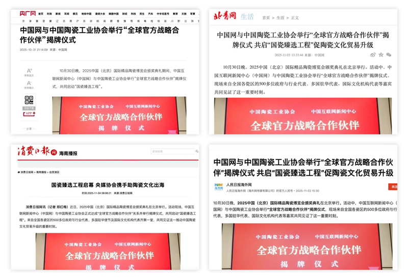 在本次博览会期间,中国互联网新闻中心(中国网)与中国陶瓷工业协会举行了“全球官方战略合作伙伴”揭牌仪式,共启“国瓷臻选工程”——该工程是中国网中国瓷的核心抓手,构建品牌营销、全球贸易、数字溯源三大功能,通过严格筛选标准,为入选企业提供国家级媒体资源支持和全球贸易渠道,推动陶瓷文化出海、助力产业实现升级。