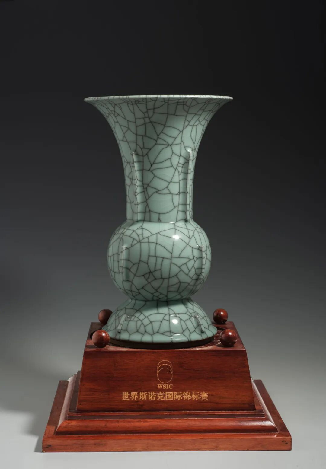 这件青瓷斯诺克国际锦标赛冠军奖杯是一件制作精良的出戟尊瓶,净高度为44cm,配以红木方形底座,形成天圆地方之势,纳天地灵气的器形,奖杯周身上下四条腾龙的简约造型,符合西方简约设计理念,同时寓意中华民族腾飞崛起,飞向四方。整个杯形又似中国古代盛酒的酒觞,寓意美酒献给来自四面八方的嘉宾,显示东方文明古国的热情好客。器型迸发积极向上的蓬勃朝气,将斯诺克运动精神与中国传统文化融于设计肌理,韵味与力量兼具。