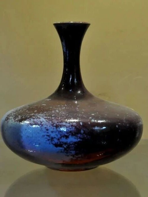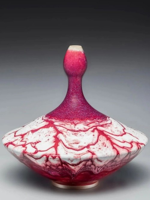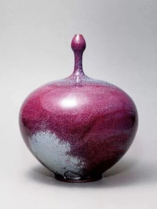 “宁整勿碎,宁简勿繁”是杨志的创作信条。他善于从生活中汲取灵感,神垕镇“大铜器”中的大排鼓,经他艺术升华成为《排鼓尊》,扁圆器身搭配两排鼓钉,瓶颈似鼓槌挺立,尽显古朴大气。经典之作《长寿瓶》更展现其精湛技艺,手拉坯成型时需站立一气呵成拉制连续螺纹,兼顾重心平衡以防烧制倾斜,煤窑烧制后釉色红紫交融,成为钧瓷螺纹装饰的典范。《吉祥尊》承袭传统造型精髓,兽头活环耳饰搭配弦纹直身,端庄浑厚,2006年被国家博物馆永久收藏;《小蝌蚪找妈妈》以荷叶盘为底,捏塑的小蝌蚪灵动鲜活,借童趣画面传递环保理念;《佛尊》则凭借 60厘米的手拉坯造型与自然窑变的釉色,尽显中华传统文化的含蓄之美。其作品《象耳尊》《三足炉》《祥瑞尊》等屡获中国工艺美术百花奖、国际陶瓷节创作大奖等殊荣,被多国博物馆、美术馆收藏。