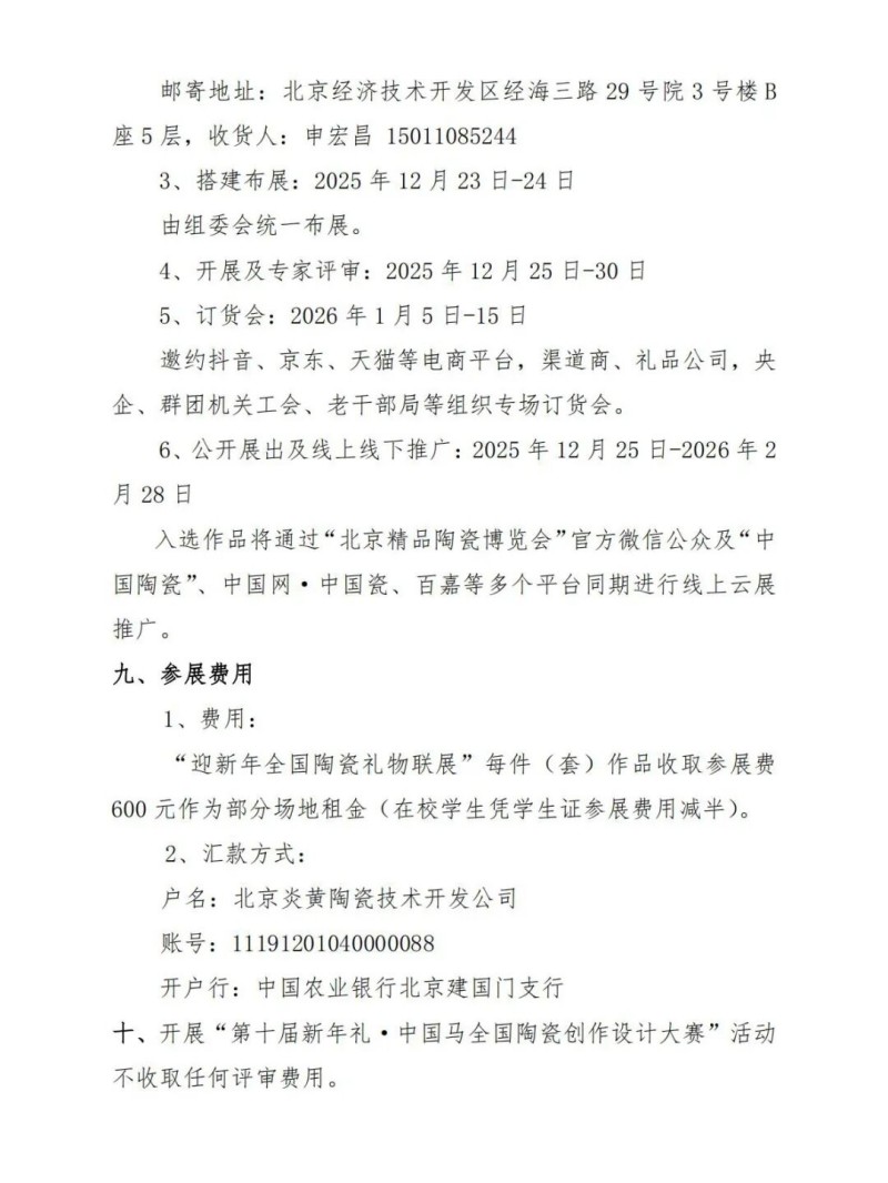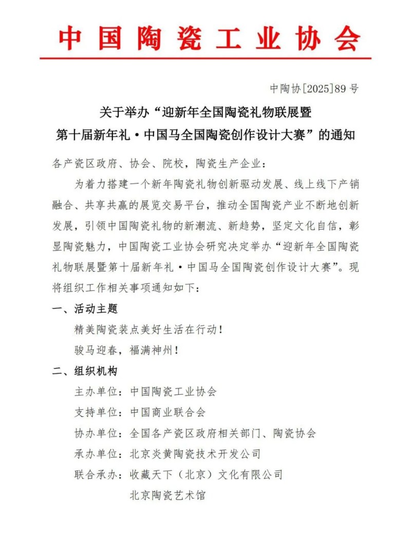为搭建新年陶瓷礼物创新发展与产销融合平台,引领陶瓷礼物新潮流,2025年12月25日至2026年2月28日,“迎新年全国陶瓷礼物联展暨第十届新年礼·中国马全国陶瓷创作设计大赛”将在北京举行。