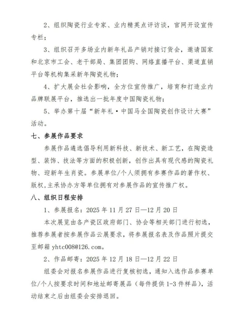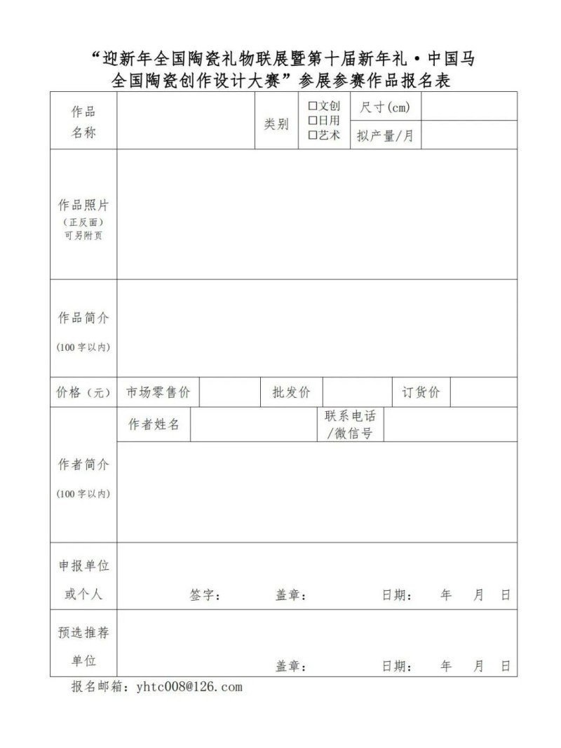 目前,参展报名工作已于2025年11月27日正式启动,12月20日截止。欢迎各产瓷区政府、协会、院校、企业及个人创作者踊跃参与,将报名表及作品照片报送至指定邮箱:yhtc008@126.com,经初选后按要求邮寄样品。