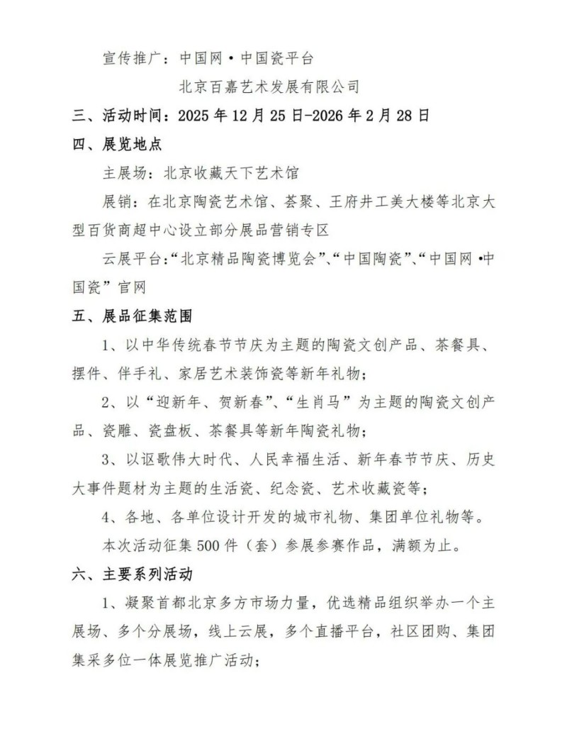 本次联展面向全国征集500件(套)以内陶瓷作品,涵盖以中华传统春节为主题的陶瓷文创产品、茶餐具、摆件、伴手礼等;以“迎新年、贺新春”“生肖马”为主题的瓷雕、瓷盘、茶具等;反映伟大时代、人民幸福生活、历史大事的生活瓷、纪念瓷与艺术收藏瓷;各城市、单位设计的城市礼物与集团礼品等。