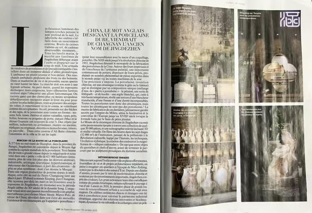 近日,法国《费加罗报》旗下深度杂志《费加罗周刊》(Le Figaro Magazine)在最新一期推出大型专题《景德镇——世界陶瓷之都》。记者玛丽-安吉丽克·奥扎纳(Marie-Angélique Ozanne)与摄影师埃里克·马丁(Eric Martin)在景德镇进行了多日走访,以近五页篇幅呈现这座千年瓷都的历史脉络、城市转型与蓬勃发展的创意生态,为法国读者带来一次充满惊喜的文化探索。