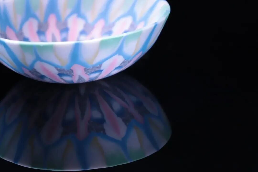 白月突破了传统绞胎瓷羽毛纹、回纹等固定纹样的局限,通过攻克不同颜色泥料收缩率不一的技术难题,开创出螺旋绞合、多层套色、自然渐变等现代纹理语言。她甚至从蒙德里安的几何构成中汲取美学灵感,让静态的陶瓷器物流动起来,呈现如水似云般的动态意象。在她手中,泥土仿佛被赋予生命,幻化出星河漩涡、细胞脉络或地质层理的奇幻景象,充满视觉张力与哲学意蕴。