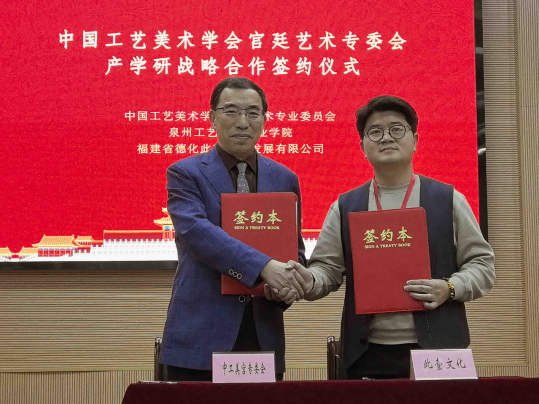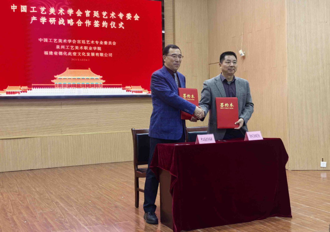 活动现场,宫廷艺术专委会分别与泉州工艺美术职业学院陶瓷与艺术学院、德化此壹文化发展有限公司达成合作意向。未来,参与各方将分别聚焦瓷艺人才培养与宫廷艺术产业化转化,为宫廷艺术与德化瓷的深度融合搭建起坚实桥梁。