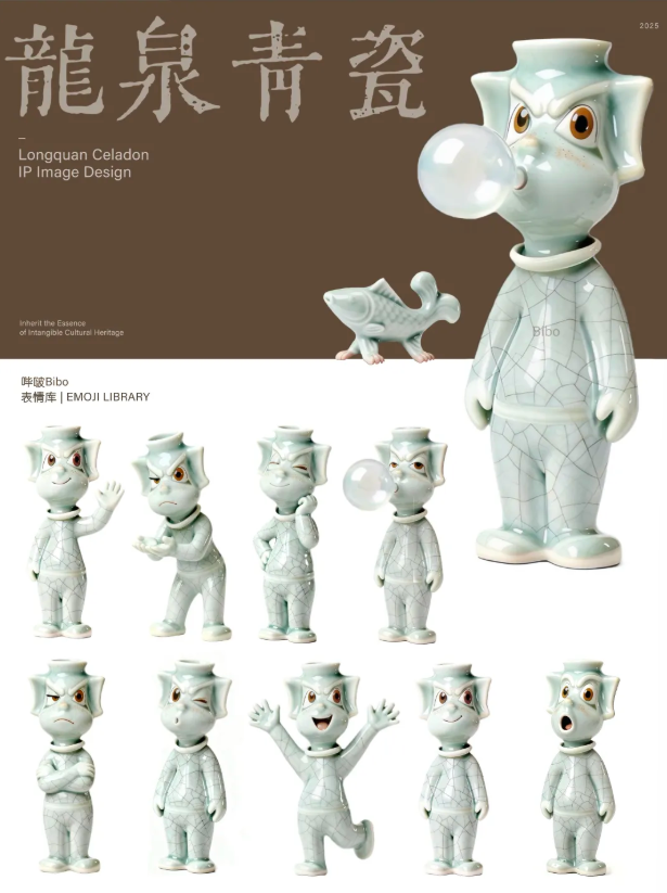个人创作者的作品同样惊艳全场。李倩设计的《瓷灵小青》,以软萌灵动的形象圈粉无数:服饰纹样提取自哥窑标志性的冰裂纹肌理,肤色采用温润的梅子青渐变,仿佛将一块鲜活的青瓷“拟人化”,完美契合年轻人的审美喜好。程欣玲带来的《哔啵》则更具创意,将龙泉哥窑的“铁线”开片纹路作为核心元素,打造了一个守护青瓷窑火的精灵形象,而“哔啵”这个名字,正是开片纹路声音的具象化表达,充满了童趣与想象力。