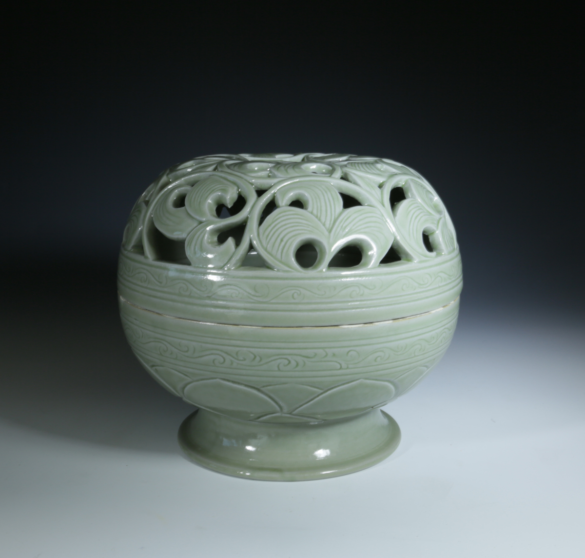 闻长庆复烧的秘色瓷缕雕缠枝香薰。宁波市文化遗产管理研究院供图
