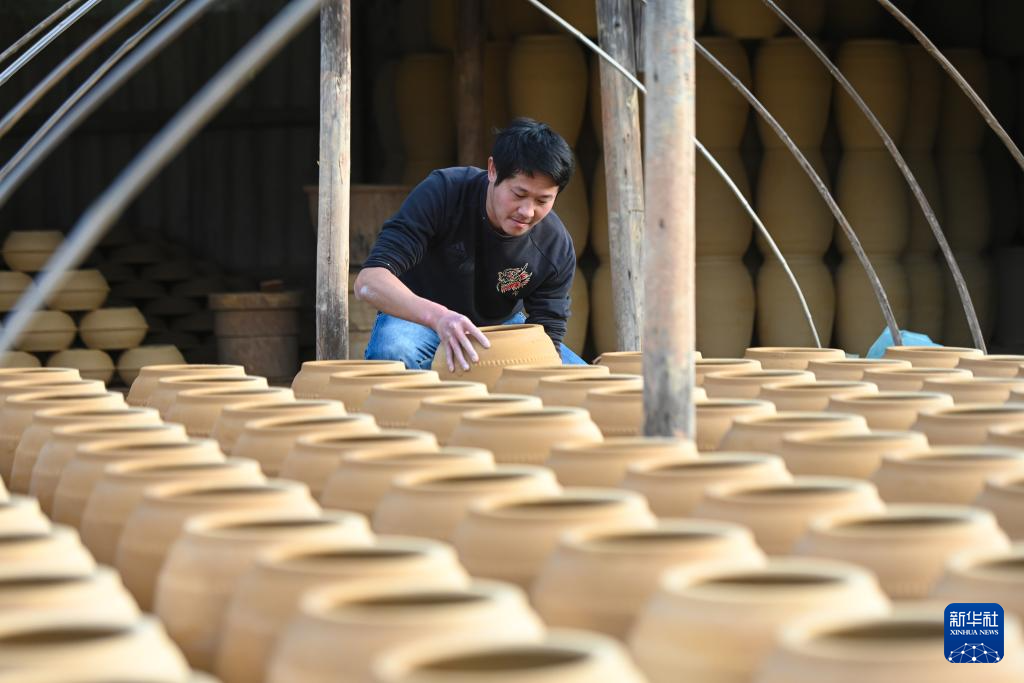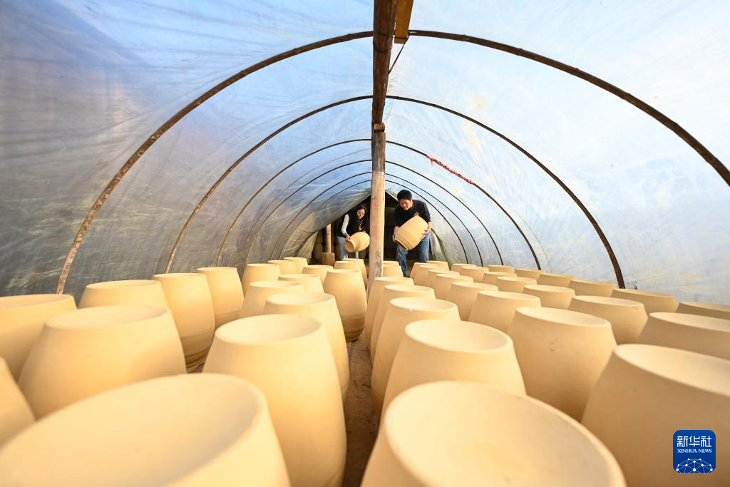 12月16日,吴泽缄和马静文夫妻俩晾晒陶坯。新华社记者 周义 摄