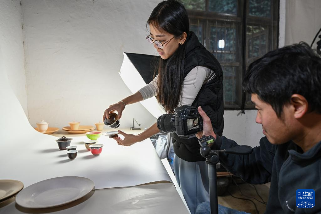 12月16日,吴泽缄(右)和马静文夫妻俩在工作室把部分成品拍摄上传网络平台。新华社记者 周义 摄