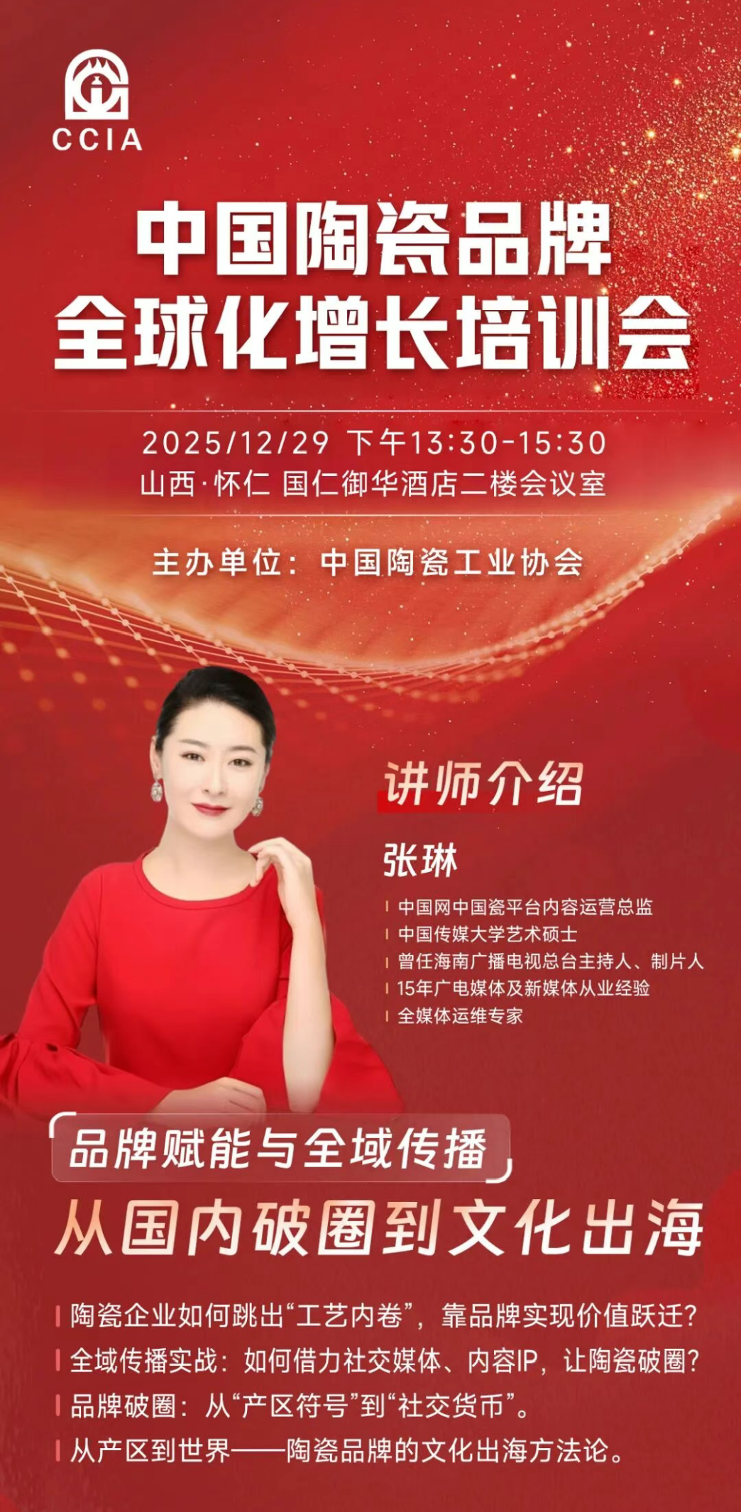 本次专题培训会特邀中国网中国瓷平台内容运营总监张琳女士担任讲师。她将带来《品牌赋能与全域传播:从国内破圈到文化出海》主题分享,直击陶瓷企业“工艺内卷严重、品牌价值薄弱、国际传播乏力”的核心痛点,深度拆解陶瓷品牌从“产区符号”升级为“社交货币”的破圈逻辑,详解如何借助社交媒体、内容IP打造实现文化出海,帮助企业明晰从文化IP构建到国际传播的落地路径,破解“有产品无品牌”的出海困境,让陶瓷品牌在全球市场实现价值跃迁。