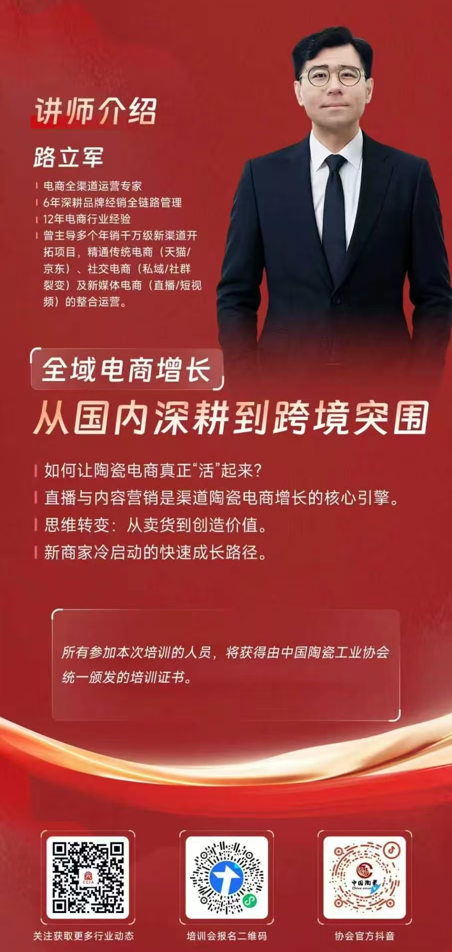 另一位讲师是电商全渠道运营专家路立军先生。他主讲的《全域电商增长:从国内深耕到跨境突围》模块,聚焦陶瓷企业“电商渠道布局零散、数字化营销能力不足、新渠道冷启动难”等实际问题,明确直播与内容营销是陶瓷电商增长的核心引擎,引导企业实现从“卖货”到“创造价值”的思维转变,同时分享新商家冷启动的快速成长路径,为企业提供可直接复用的直播运营、爆款打造等实战工具包,助力企业在跨境电商赛道实现突围增长。