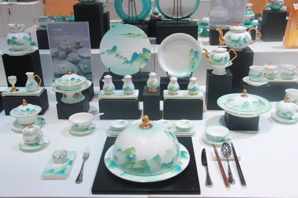 淄博汉青陶瓷有限公司总经理黄少晨介绍,《江山如画》的创意元素选自北宋画家王希孟创作的《千里江山图》,撷取其中的青绿山水,首次尝试用数字化技术大规模地将中华传统绘画呈现在瓷器上。
