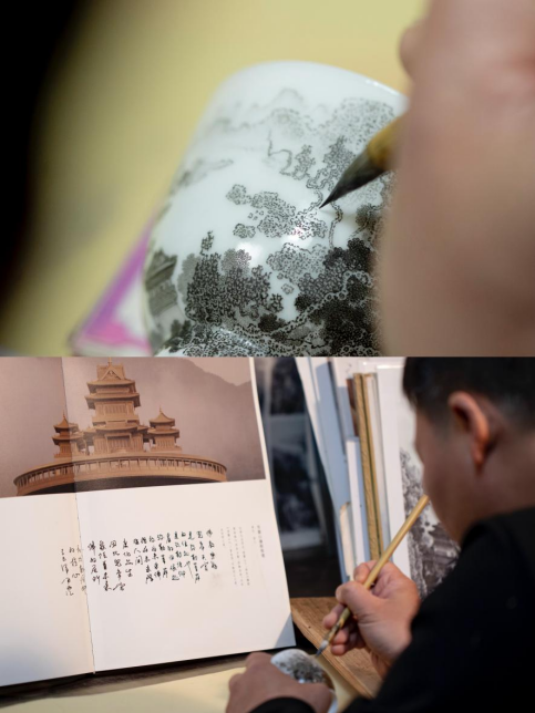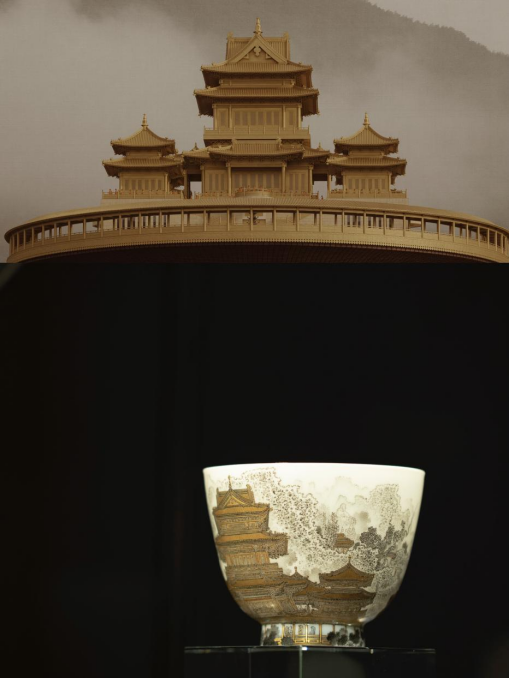 创作过程中,鄢用林摒弃传统界尺,徒手运笔推演北宋《营造法式》的严密逻辑,以极细笔锋反复堆叠墨色,造就“色如铸铁、触之有痕”的浮雕质感;同时辅以手工描金工艺,复刻旭日照亮金顶的辉煌瞬间,让影像中稍纵即逝的光影,在瓷器上凝固为可触摸的永恒。这一跨界创作,既是“影”与“瓷”的媒介融合,更是“纳须弥于芥子”的极致工艺挑战。