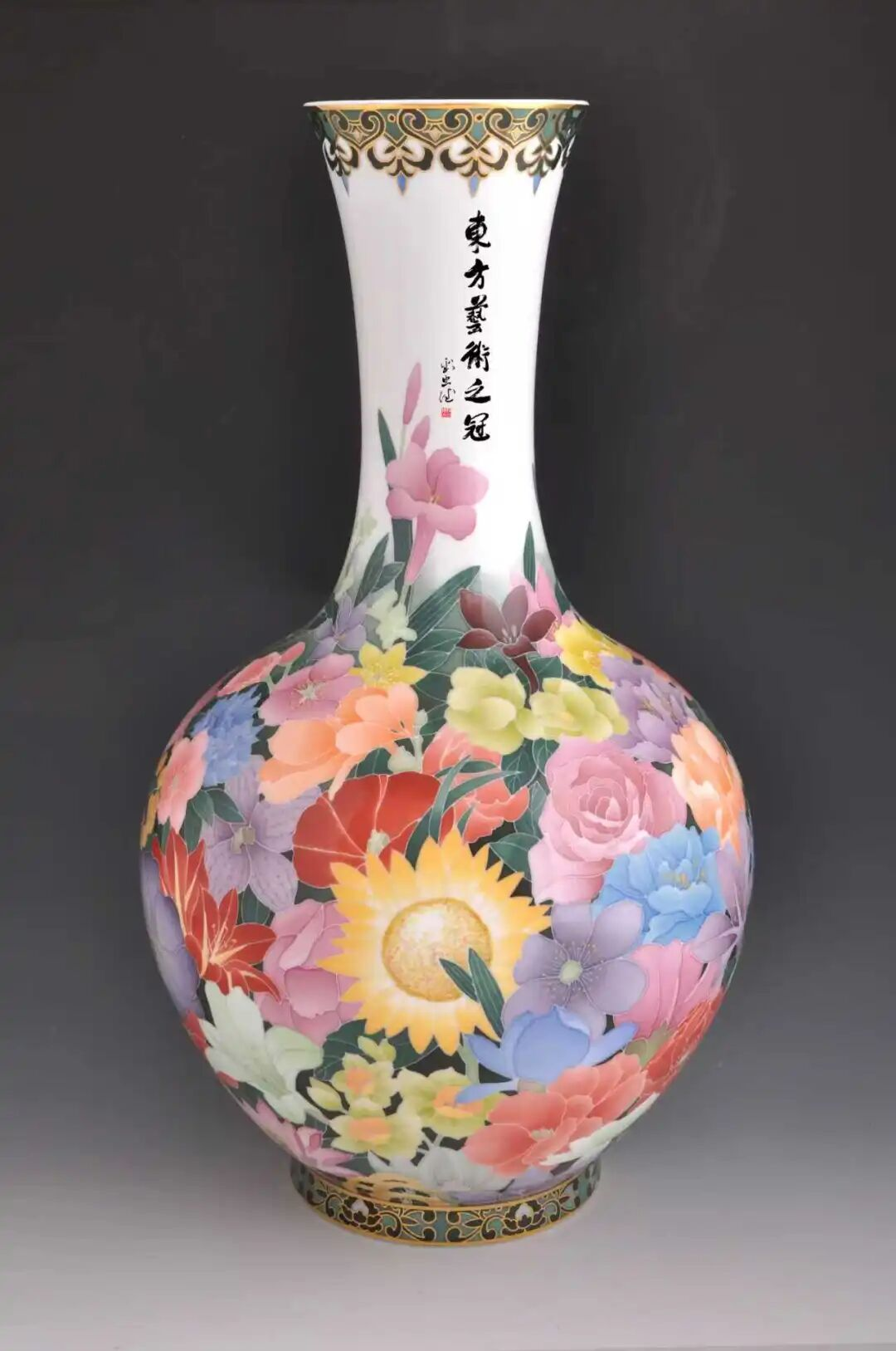 该瓶高50厘米,器型设计融合了经典“天球瓶”的浑圆饱满与“赏瓶”的端庄典雅,整体造型大气凝重、线条流畅。最引人注目的是其主体部分呈现为一个完美球体,象征着地球——人类共同生活的家园。在这个意象丰富的“地球”之上,艺术家以超凡的想象力和细腻的笔触,将世界各国的国花巧妙组合、精心布局,构成一幅绚烂多彩、和谐共生的百花图卷。