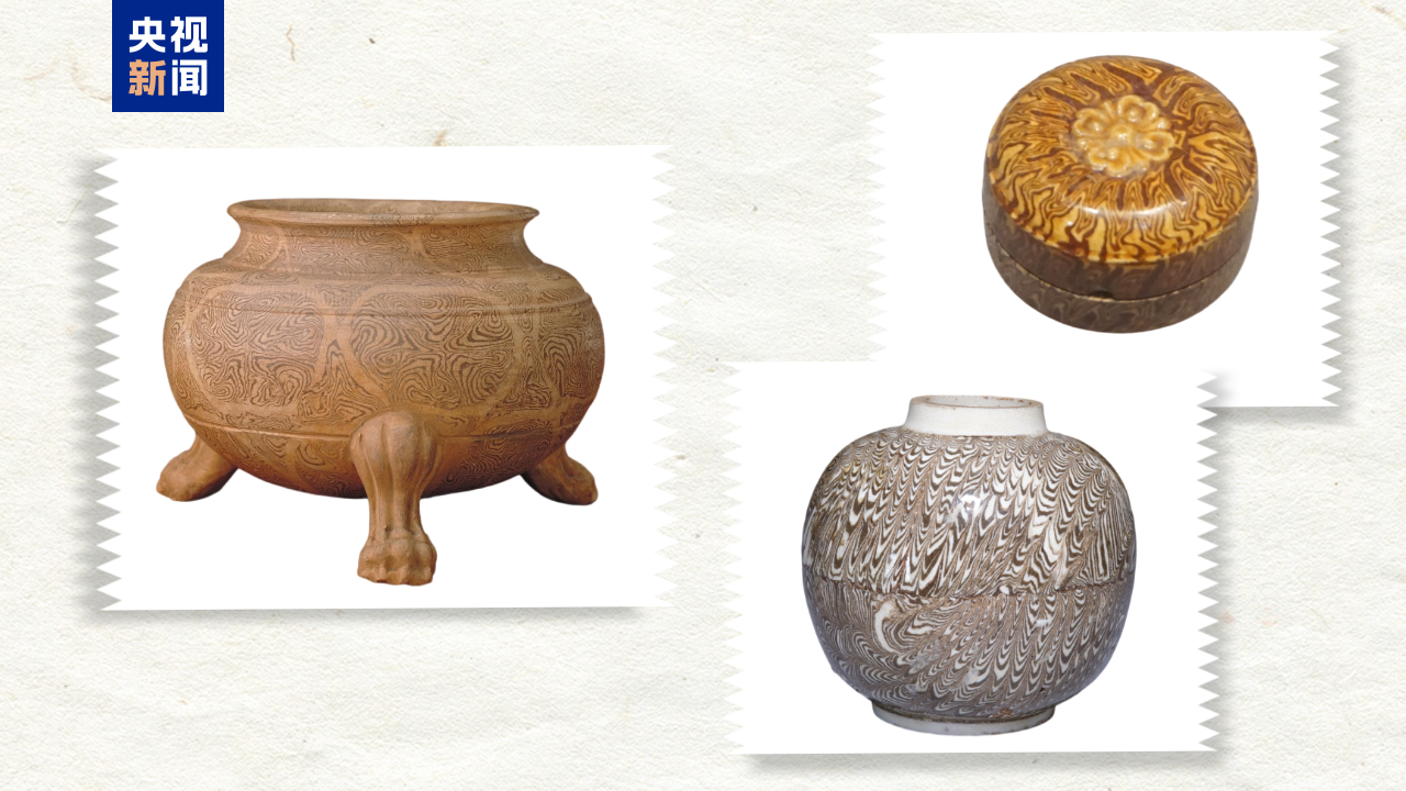 △左:唐巩义窑绞胎三足炉故宫博物院藏;右上:唐绞胎粉盒陕西历史博物馆藏;右下:宋白釉绞胎罐故宫博物院藏