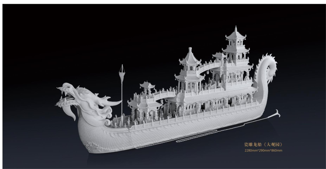吴建华精通捏雕、镂雕、圆雕、浮雕、微雕、镶接、堆雕等数十种传统技法,同时深耕材料化学特性分析、几何力学、窑烧火候控制等专业领域。他曾耗时7年精心打磨的特大型瓷雕龙船《大观园》,成为享誉中外的巅峰之作。这件作品以中华图腾巨龙为载体,巧妙融入《红楼梦》经典情节,还原了怡红院、潇湘馆等标志性景观,600余件大小瓷雕错落有致,人物神态栩栩如生。